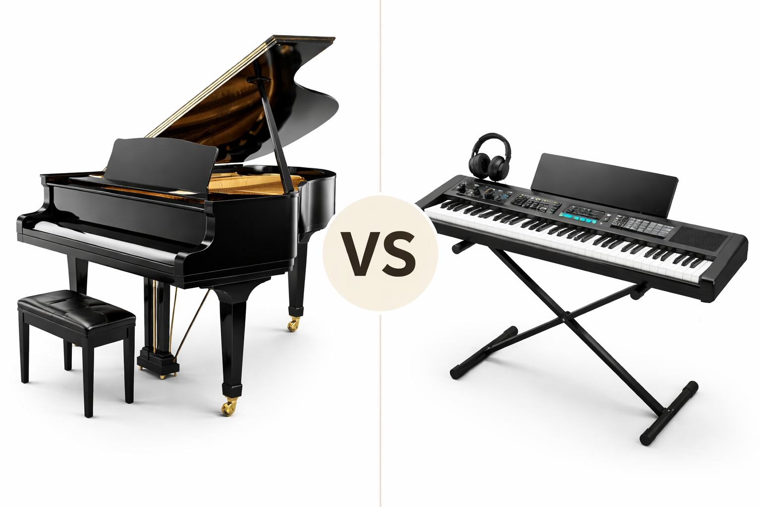 This is the most important thing to understand before you spend a single dollar. An acoustic piano and a keyboard are fundamentally different instruments. They look similar, and they play the same notes — but the experience of playing them, and what they teach your hands and ears, is completely different.